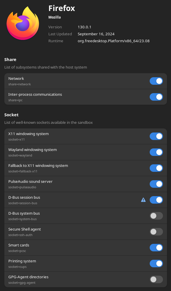 First, Firefox needs access to the DBus session and some directories in the $HOME directory to use the native messenger and interact with the host system.